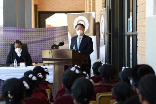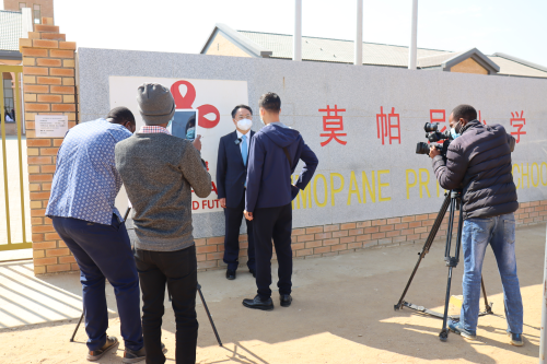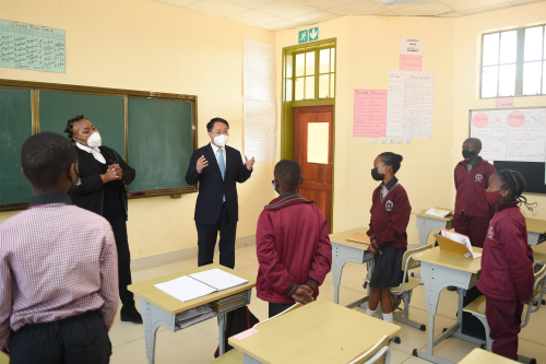 2022年7月29日,驻博茨瓦纳大使王雪峰赴博奎嫩区参观中国援博莫帕尼小学,并在学校师生的欢迎仪式上致辞。