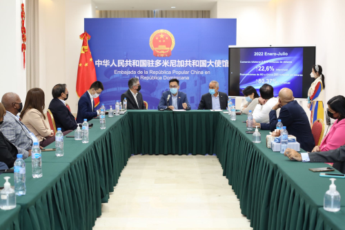 2022年8月31日,驻多米尼加使馆同多有线电视协会(ADETEL)举行座谈会,就中国经济形势及中多双边合作进行交流。驻多米尼加使馆临时代办张步新、多有线电视协会主席巴尔加斯及协会15家地方电视媒体负责人出席。