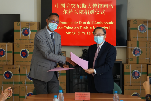 随后,张大使代表驻突尼斯使馆向马尔萨医院捐赠了一批抗疫医疗物资,在捐赠仪式上签署了交接证书。张大使表示,新冠疫情发生以来,中突医疗卫生合作更加紧密,成为两国友好关系的重要组成部分。中方将秉持真实亲诚理念和正确义利观,与突方携手共建卫生健康共同体。本·纳赛尔局长、阿亚里院长分别致辞感谢中方慷慨帮助和一贯支持,这充分证明了两国政府和人民间的深情厚谊,表示将继续为中国医疗队员在突工作和生活提供便利。