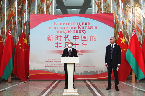谢大使在致辞中表示,十月十六日,举世瞩目的中国共产党第二十次全国代表大会在北京隆重开幕,这是在中国共产党团结带领全国各族人民迈上全面建设社会主义现代化强国新征程、向第二个百年奋斗目标进军的关键时刻召开的一次十分重要的大会。为庆祝这一伟大盛会召开,中国国务院新闻办公室和中国驻白俄罗斯使馆在白俄罗斯伟大卫国战争历史博物馆举办为期一个月的“新时代中国的非凡十年”图片展,以向白俄罗斯朋友和驻白外交使团讲述2012年11月中国共产党十八大到2022年10月中国共产党二十大间新时代非凡十年的精彩故事,介绍中国共产党如何在十年间带领中国人民塑造了生机蓬勃的繁荣国家,成就了欣欣向荣的美好生活,弘扬了奋发奋进的民族气质,为世界擘画了构建人类命运共同体的美好愿景。