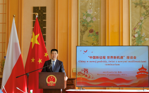 2022年10月27日,驻波兰使馆举办“中国新征程 世界新机遇”二十大精神宣介座谈会,驻波兰大使孙霖江发表主旨演讲。波议会波中议员小组副主席科斯图希、媒体协会主席特拉齐克、波中友协主席斯卡温斯卡、“波兰家园”公民协会副主席哈珀、马尔沙维克出版集团总裁马尔沙维克、“名人录”出版社社长泽姆斯基及波前投资贸易局局长马伊曼、前驻上海总领事沙法仕等各界代表近20人出席。