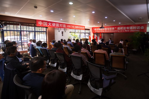 2022年10月28日,驻肯尼亚大使周平剑出席由中央广播电视总台非洲总站举办的“新征程的中国与世界”肯尼亚专场对话会,同40余名非方记者编辑互动交流。