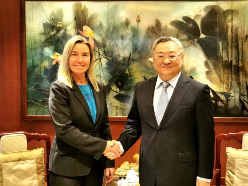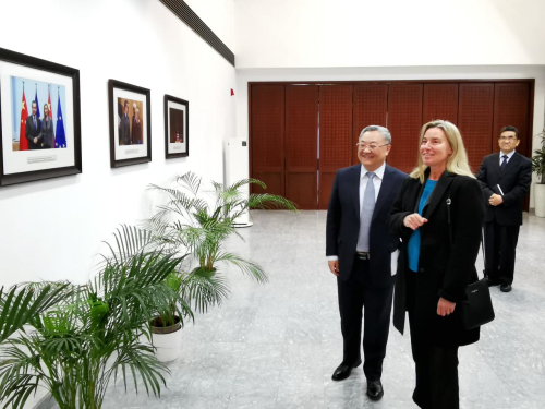 2023年5月15日,驻欧盟使团团长傅聪大使会见欧洲学院院长莫盖里尼。