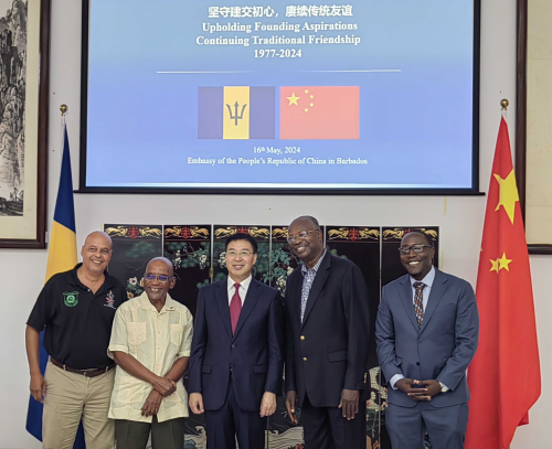 2024年5月16日,驻巴巴多斯使馆举办“回顾建交初心,我们一道前行”座谈会,庆祝中巴建交47周年。驻巴巴多斯大使延秀生、巴前驻华大使布拉斯维特、巴中友协主席沃雷尔、巴政府新闻办主任亨利及巴方友好人士代表约20人出席,巴外长西蒙兹致贺。