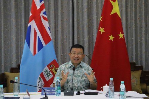 2024年8月30日,驻斐济大使周剑在官邸举行斐济总理兰布卡访华专题媒体学者吹风会。斐济总理代表团成员,斐济太阳报、斐济时报、斐济广播公司、斐济电视台、斐济村新闻网、玛宜电视台、斐济日报等媒体主编、记者,外交部官员等20余人出席。