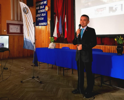 2024年10月25日,康拉迪诺姆(CONRADINUM)船舰和技术学校举办“中国文化日”活动,驻革但斯克总领事樊晓东出席并致辞,校长布托夫斯基、革但斯克大学孔子学院中方及波方院长等及康校100余名学生参加。