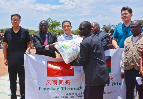 2024年11月7日,驻马拉维使馆向松克维地区遭遇粮荒的民众捐赠粮食。驻马拉维使馆临时代办王浩、马灾害事务管理局局长卡勒巴、马外交部代表、当地议员及传统领袖等出席捐赠仪式。