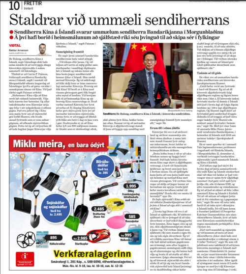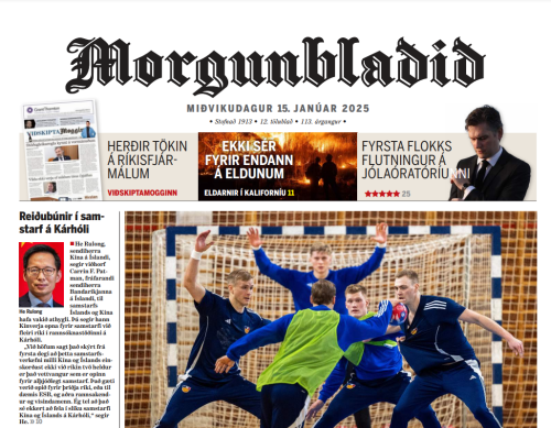 2025年1月15日,冰岛《晨报》(Morgunblaðið)报纸和网站在头版头条刊登对驻冰岛大使何儒龙专访,驳斥有关涉华负面言论,宣介构建人类命运共同体理念。