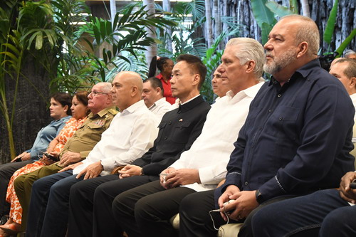2025年9月29日,古巴共产党和政府在革命宫隆重集会,庆祝中古建交65周年暨中华人民共和国成立76周年。驻古巴大使华昕、古巴国家主席迪亚斯-卡内尔,总理马雷罗等党和国家领导人,中资企业、华侨华人和留学生代表300多人出席。
