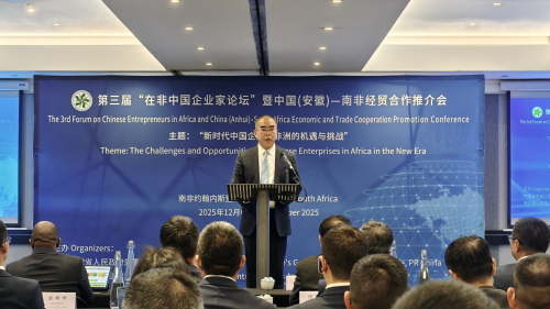 2025年12月6日,驻约翰内斯堡总领事潘庆江出席第三届“在非中国企业家论坛”暨中国(安徽)—南非经贸合作推介会,安徽省政协副主席郑宏及代表团成员、南非有关部门和地方官员、工商界及在南和部分非洲国家中国企业家代表参加。
