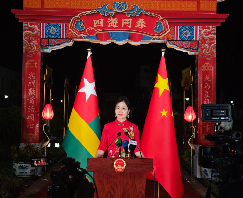 2026年2月2日,驻多哥使馆举办新春招待会,驻多哥大使王敏,多前总理多贝、部长会议主席府秘书长约翰逊、政府秘书长巴巴、经济部长帕托基、中资机构和华侨华人等500余人欢聚一堂,共庆中国马年新春。