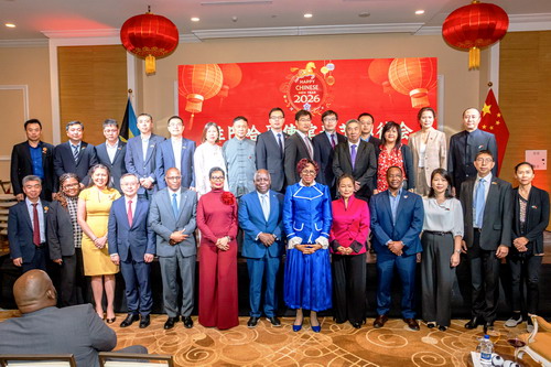 2026年2月12日,驻巴哈马使馆举办春节招待会。驻巴哈马大使严家蓉,巴总督普拉特、总理戴维斯夫妇、反对党领袖平塔德、多位内阁部长、中资企业和华侨华人等近400人参加。