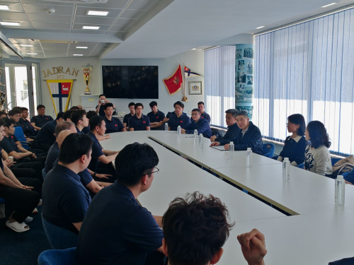 陈大使高度赞赏全队展现出的拼搏精神与精湛技艺。他表示,当前全党全国正深入贯彻两会精神,昂首迈入“十五五”规划建设新征程。习近平主席强调,体育强则中国强,国运兴则体育兴。今年适逢中黑建交20周年,体育是连接两国友谊的重要纽带。希望大家将建设体育强国的使命感转化为拼搏动力,书写新时代中国体育人的担当,预祝中国队在世界杯上取得佳绩。