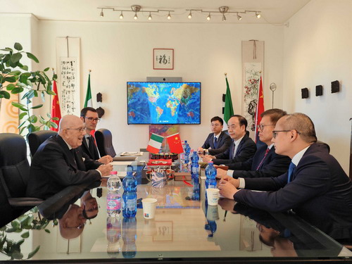 2026年4月23日,驻米兰总领事张承刚拜会意中理事基金会主席马里奥·博赛利。意中理事基金会首席运营官帕西尼参加会见。