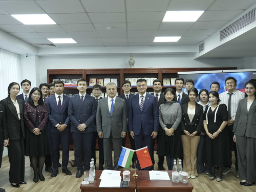 2026年4月24日,驻乌兹别克斯坦大使于骏走进乌世界经济与外交大学,在“习近平总书记著作书屋”同青年学生交流互动。乌最高会议参议院第一副主席、该校校长萨法耶夫及师生代表出席。