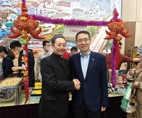 中国使馆展台前人头攒动,气氛热烈,成为活动现场的“网红打卡点”。扬州炒饭香气四溢,熊猫主题纪念品、剪纸作品、“一带一路”筷子套装、青瓷茶具、唐三彩小马等中国特色工艺品琳琅满目,来宾纷纷驻足购买、拍照留念,沉浸式感受中华传统文化独特魅力。使馆青年外交官身着中式服装热情“带货”,与现场来宾互动交流。亚信秘书长萨雷拜和多国驻哈使节参观中国使馆展台并与韩大使亲切交谈。韩大使现场接受多家媒体采访。
