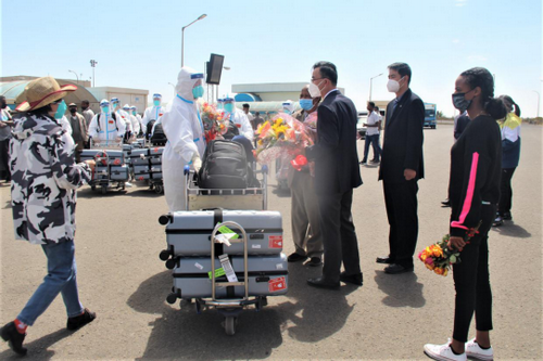 2022年2月18日,驻厄立特里亚大使蔡革、厄卫生部国际关系司司长哥麦共同赴机场迎接第15批中国援厄医疗队。