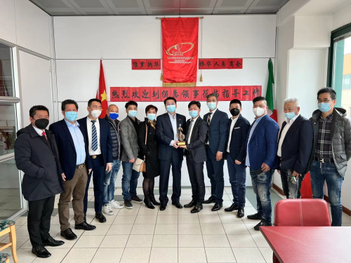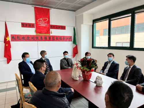 2022年3月16日,驻米兰总领事刘侃访问维罗纳,走访华商企业胡氏拉链集团,看望侨胞并与侨界代表座谈。维罗纳华侨华人总商会会长、胡氏拉链集团董事长胡从炼及侨团负责人陪同走访并参加座谈。