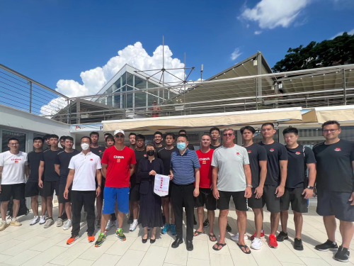 2022年8月23日,驻黑山使馆临时代办华亚芳赴黑山南部城市新海尔采格看望慰问来黑训练备战巴黎奥运会的中国国家男子水球队。