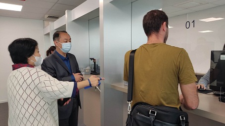 董总领事一行在签证中心负责人陪同下察看了接待大厅、服务窗口、业务后台等区域,认真听取了签证代办服务工作情况汇报,并和大家热情交流。
