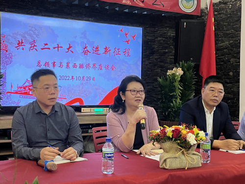 2022年10月29日,驻累西腓总领事严宇清出席“共庆二十大 奋进新征程”累西腓侨界座谈会,向侨胞宣介党的二十大精神。累西腓华侨华人协会会长卢功荣、中巴工商外贸联合总会会长陈忠、巴西东北部广东同乡会名誉会长苏梓祐以及累西腓侨界代表等出席并座谈。