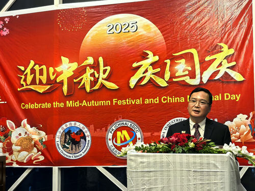 2025年9月27日,巴基斯坦山东商会、拉合尔华联会、熊猫商会举办国庆中秋庆祝活动,驻拉合尔总领事赵世人应邀出席并致辞。领区华侨华人、中资企业代表、巴方友人、华文学校学生等80多人参加。