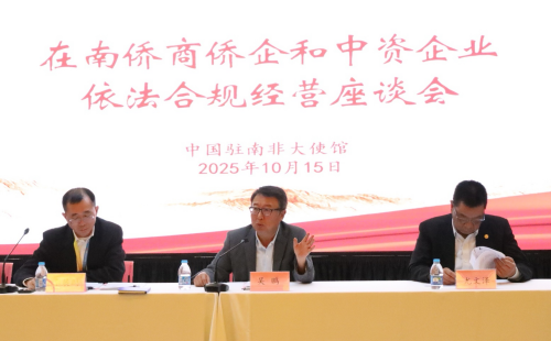 2025年10月15日,驻南非使馆举办在南侨商侨企和中资企业依法合规经营座谈会,驻南非大使吴鹏、驻开普敦总领事尤文泽、驻德班总领事李志工、驻约翰内斯堡总领事潘庆江出席并讲话,在南侨商侨企和中资企业20名代表与会。