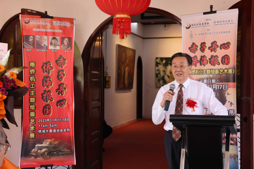 2025年11月17日,驻槟城总领事周游斌出席“赤子丹心·侨海报国”南侨机工主题绘画艺术展开幕式,槟岛市议员陈淑湘、郭玉琪,槟城水墨画协会会长罗贵龙,槟城孙中山协会会长林秋雅,中国画家代表和槟城水墨画协会代表及当地观众等参加活动。