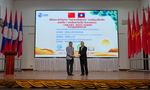 同日,张社平总领事向苏发努冯大学校长维拉移交云南省人民对外友好协会主办的“心联通 云南行”老挝中文+职业教育示范平台建设项目。