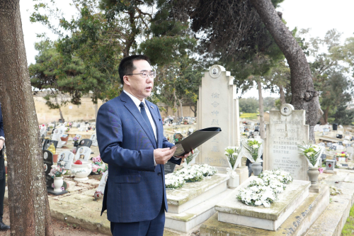 2026年4月2日,驻马耳他大使张佐带领使馆全体馆员及在马中资机构代表来到马耳他阿多洛拉塔公墓,举行一年一度的祭扫烈士墓仪式,悼念上世纪70年代在参与中国援马干船坞工程建设中献身的徐会仲烈士和谷岩昭同志。