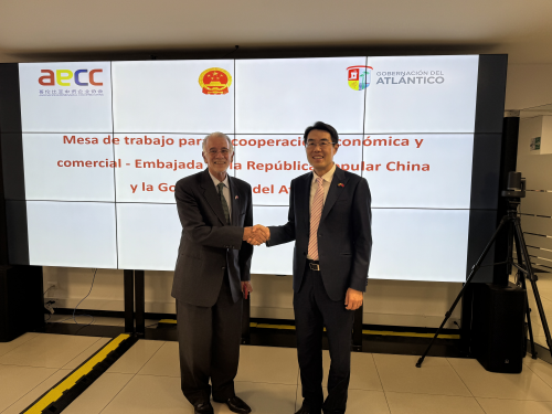 2026年4月14日,驻哥伦比亚大使朱京阳出席中资企业与大西洋省洽谈会并致辞。大西洋省省长贝拉诺和该省规划、国际合作、信息通信等多个部门负责人,哥中企协副总经理朱欣和20余名中企代表参加。