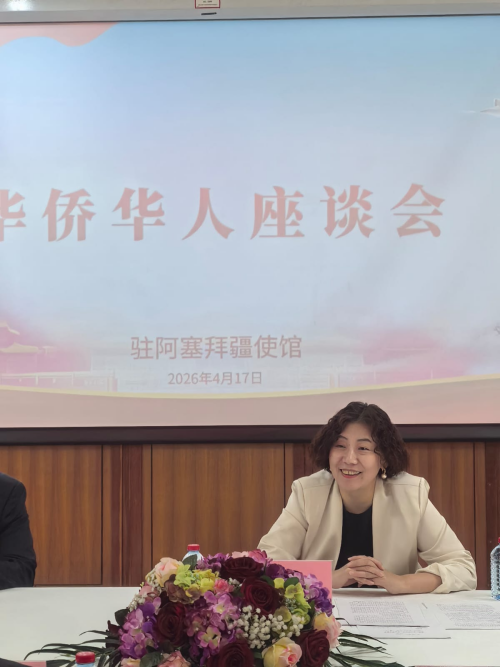 2026年4月17日,驻阿塞拜疆大使鲁梅出席华侨华人座谈会,阿华侨华人和留阿学生代表参加。