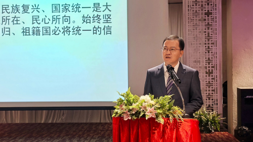 陈总领事全面介绍习近平总书记在北京会见中国国民党主席郑丽文时发表重要讲话精神。强调重要讲话深刻阐明新形势下推动两岸关系和平发展、推进祖国统一大业的大政方针,为两岸关系发展进一步指明了方向,是反“独”促统事业的行动指南。陈总领事赞赏统促会长期坚持“九二共识”、反对“台独”分裂,希望大家以实际行动维护一中原则、反对分裂行径,为祖籍国统一和中泰友好事业做出贡献。