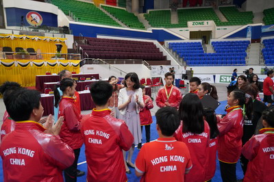 期间,于大使看望了来自内地、香港和澳门的运动员及教练员,祝贺运动员取得优异成绩,鼓励选手奋力拼搏、相互学习,切磋技艺,共同提高。