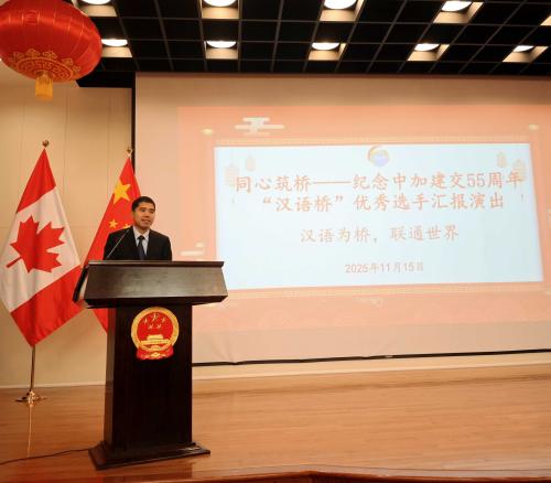 2025年11月15日,同心筑桥——纪念中加建交55周年“汉语桥”优秀选手汇报演出活动在驻加拿大使馆举行。驻加拿大大使王镝出席并致辞。