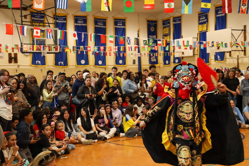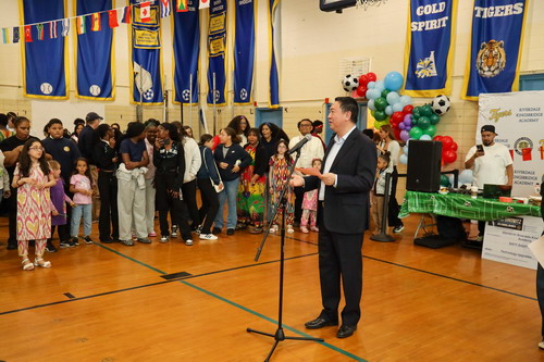 2026年4月23日,驻纽约总领馆参加纽约市第141中学“同一个世界,同一个目标”国际文化开放日活动。驻纽约总领事陈立作为特邀嘉宾出席活动并致辞,纽约市议员迪诺维茨、校长奥米拉以及该校师生、家长等500多人参加。