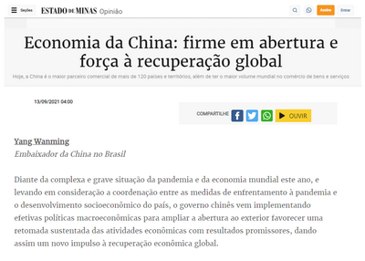 2021年9月13日,驻巴西大使杨万明在巴西主流媒体《米纳斯州报》发表题为《中国经济:坚持对外开放 助力全球复苏》的署名文章,介绍疫情下中国经济稳定恢复形势,解读近期中国市场监管政策。