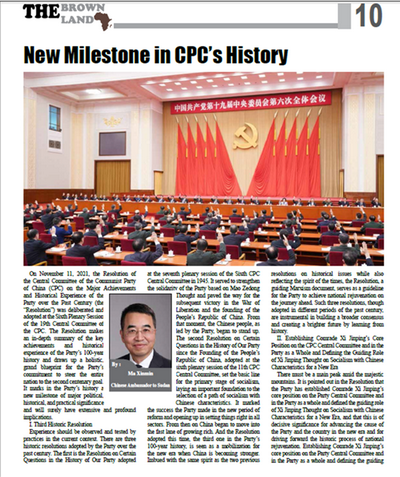 2021年12月7日,驻苏丹大使马新民在《褐色大地报》发表题为《中国共产党历史上新的里程碑》的署名文章,介绍中国共产党十九届六中全会重要成果和重大意义。全文如下: