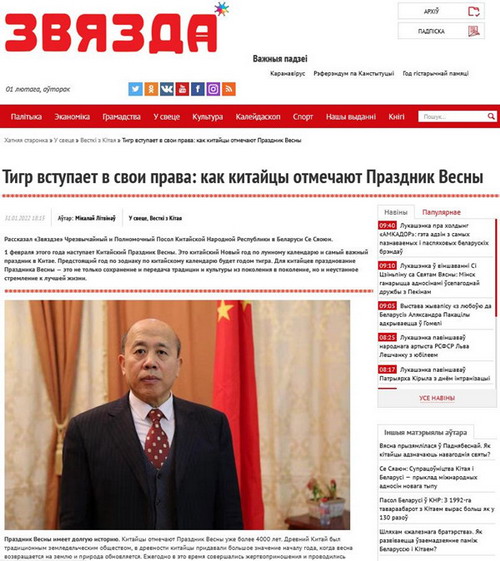 2022年2月1日,驻白俄罗斯大使谢小用在白俄罗斯《星报》发表署名文章《虎年展虎姿:中国人如何过春节》。文章全文如下: