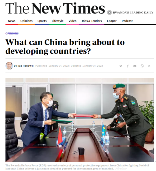2022年2月1日,驻卢旺达大使饶宏伟在《新时代报》、“今日基加利”、“时间”新闻网等卢旺达主流媒体发表题为《中国将为发展中国家带来什么》的署名文章。