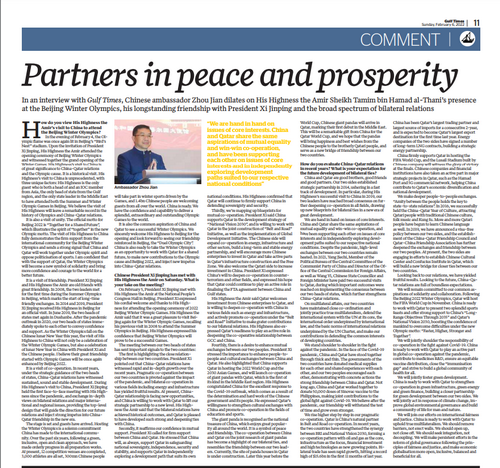 2022年2月4至5日,卡塔尔埃米尔塔米姆赴华出席北京2022年冬奥会开幕式,习近平主席同其举行双边会见,引发卡社会各界高度关注。驻卡塔尔大使周剑在会见结束后两个小时接受卡主流媒体书面采访,高度赞赏塔米姆埃米尔中国之行的重大意义,深度解读两国元首会晤达成的重要共识,积极评价近年来中卡关系取得的丰硕成果,热切展望两国关系发展的美好前景。
