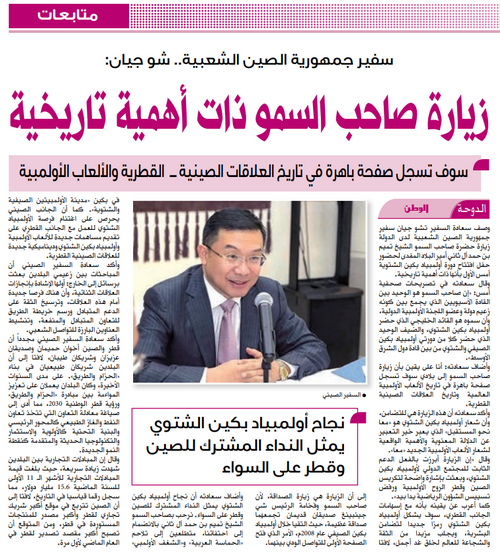 2月6日,《东方报》、《祖国报》、《路赛报》、《海湾时报》、《阿拉伯人报》等当地英、阿文主流媒体纷纷在头版或显著位置全文或大篇幅刊发周剑大使书面采访内容。采访全文如下: