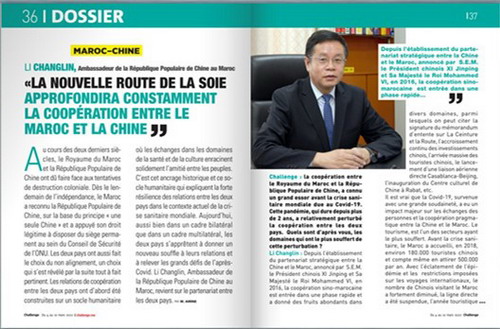 2022年3月4日,驻摩洛哥大使李昌林就新冠肺炎疫情对两国务实合作影响、中摩携手共建“一带一路”、中非团结抗疫等接受摩主流期刊《挑战者周刊》采访。