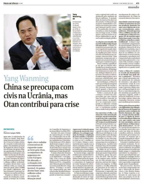 2022年3月5日,在驻巴西大使杨万明离任之际,巴西发行量最大的报纸《圣保罗页报》刊发该报知名记者梅洛对杨大使的专访。杨大使重点就中巴关系、中国外交、全过程人民民主及中方对当前乌克兰问题的立场等回答提问。