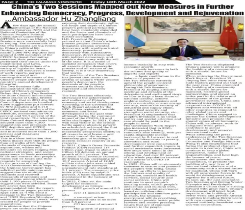 2022年3月18日,驻塞拉利昂大使胡张良在塞《卡拉巴什报》等当地主流媒体发表题为《中国“两会”擘划促进民主、进步、发展、复兴新举措》的署名文章,全文如下: