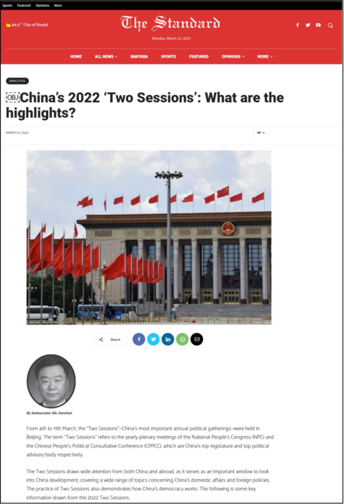 2022年3月21日,驻冈比亚大使马建春在冈比亚主流媒体《旗帜报》发表署名文章《中国2022年两会有哪些亮点?》,介绍2022年两会情况、全过程人民民主理念与实践、全球发展倡议等,展望中非中冈友好合作光明前景。主要内容如下: