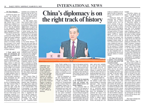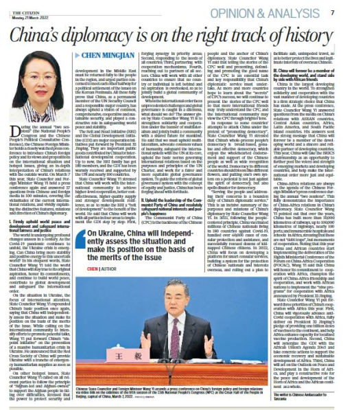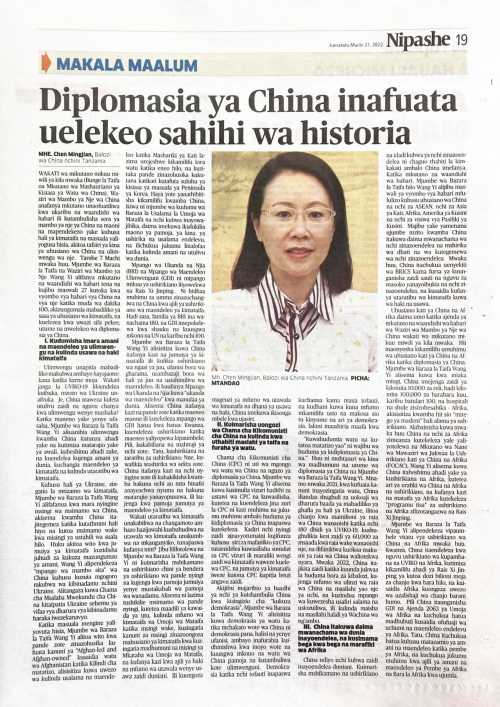 2022年3月21日,驻坦桑尼亚大使陈明健在坦主流英文报纸《每日新闻》、《公民报》和主要斯瓦希里语报纸《消息报》发表署名文章《中国外交:站在历史前进的正确方向上》,深入解读王毅国务委员兼外长在2022年两会记者会上关于中国外交政策和对外关系的精彩答问。全文如下: