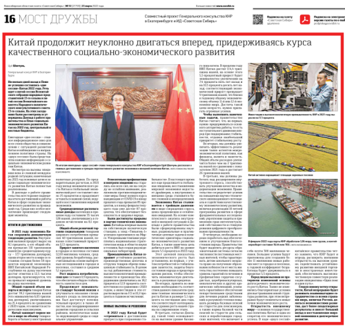 2022年3月22日和23日,驻叶卡捷琳堡总领事崔少纯分别在斯维尔德洛夫斯克州和新西伯利亚州影响力最大的官方报纸《州报》和《苏维埃西伯利亚报》发表署名文章《中国将继续沿着经济社会高质量发展总航向稳步前行》,宣介中国2022年两会的主要内容和重要意义。文章全文如下: