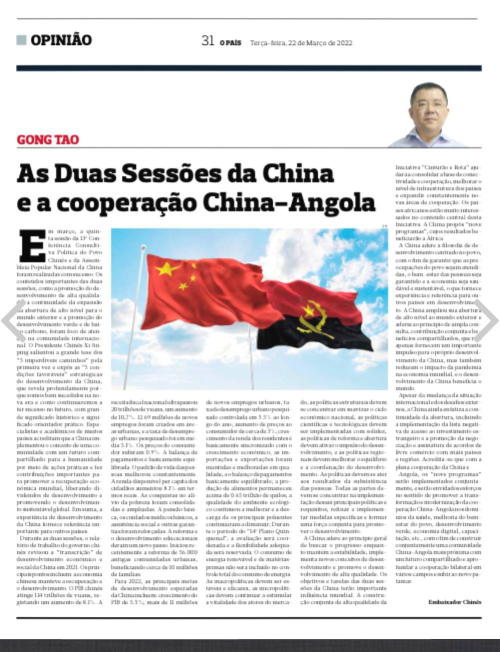 2022年3月22日,驻安哥拉大使龚韬在安《国家报》发表署名文章《2022年中国全国两会吸引全球目光》,全文如下: