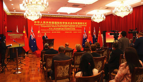 今天,我荣幸地在此代表中国政府向欧瑞莉教授颁授合作奖奖章及证书。这体现了中国政府对欧瑞莉教授为中澳科技交流与合作所作贡献的高度肯定,也表达了中国人民对澳大利亚友人的崇高敬意。